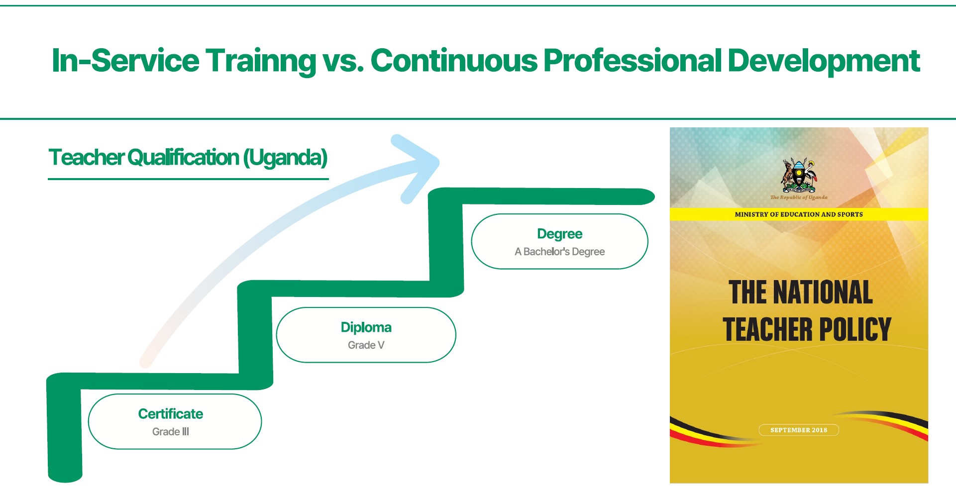 현재 우간다에서도 교사들이 학사 학위를 받기 위해 사범대학에 다시 가야 합니다. 대부분의 선생님들은 Certificate을 가지고 계시고, 교감, 시니어 선생님들은 Diploma를, 교장 선생님들은 Degree를 가지고 계셔요. 2019년에 우간다 국가 교육 정책이 변경되면서, 모든 초등 교사들이 학사 수준의 교사 교육(Degree in Education)을 의무적으로 받아야 해요. 2030년까지 유예 기간을 주긴 했지만, 교사 월급의 10배가 넘는 대학 학비를 선생님들이 마련하셔서 셀프 스터디 하시긴 어려운 상황입니다.