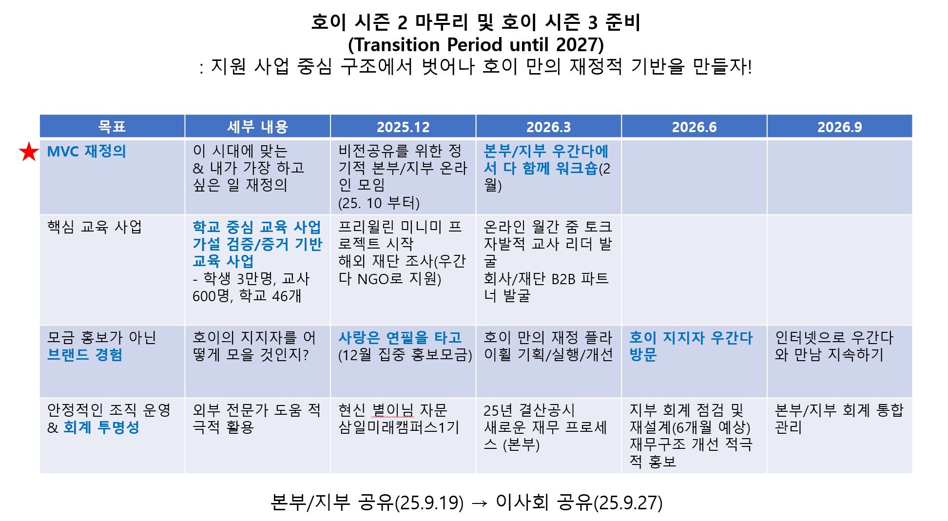 저는 호이 시즌 3를 생각할 때 다음 10년을 갈 수 있는 큰 질문이 필요하다고 생각했는데요. 호이의 권기성 이사님과 점심을 먹으며 “10년 후 계획이 아니라, 3개월, 6개월, 1년 후 계획을 세워야 한다”는 것을 배웠어요. 프린스턴 대학교 허준이 교수님이 인터뷰에서 강조한 “작은 질문”의 중요성과도 일맥상통하는 내용이었어요. 지금 저에게 필요한 작은 질문은 “3개월, 6개월, 1년 후에 뭐 하지?”였어요. 제 나름대로 답변을 해 보고, 그 답변을 기반으로 향후 계획의 초안을 만들어 한국 본부와 우간다 지부, 이사회에 공유했습니다.